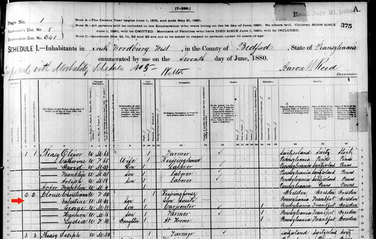 1900: In the following excerpt from the 1900 census records of South Woodbury Township, Valentine Clouse is listed as a Pennsylvania-born gunsmith living in the household of his German-born mother.