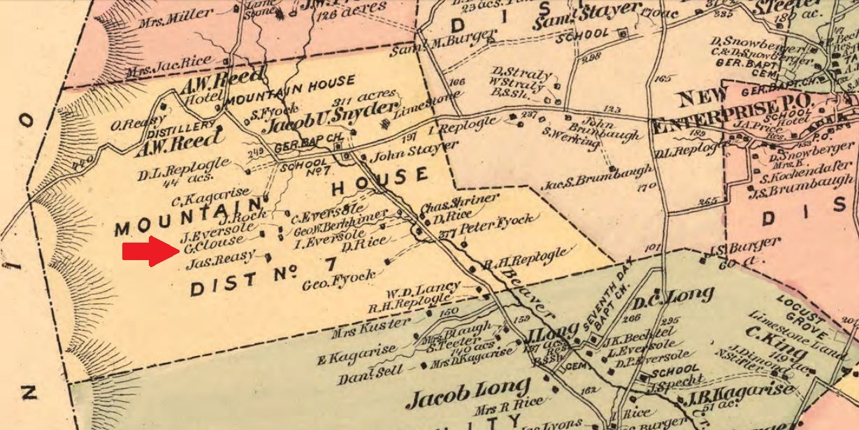 1861: As shown below, the "G. Clouse" residence appears on the 1861 Walker map of Bedford County. I think this residence is where Felty lived out his life, approximately at 40.16909, -78.4676.