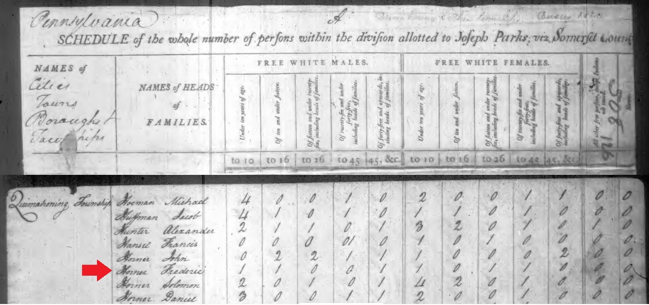 1800: In the 1800 census of Quemahoning Township of Somerset County, there is a Frederic Horner household with one male in the 45 & up age bracket, one female in the 26 to 45 age bracket, one female in the 16 to 26 age bracket, one male in the 10 to 16 age bracket, and one male and one female in the under 10 age bracket. This is the only Frederick Horner that that I could find in the 1800 census records of Somerset County, Pennsylvania. An individual in the 45 & up age bracket would have been born during or before circa 1755.