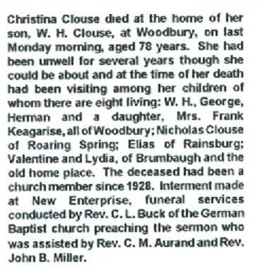 1901: Based on the type font, the following appears to be a transcript of an obituary of George Clouse's wife that was published in the November 13, 1901 issue of the "Altoona Tribune" newspaper. It indicates that her children Valentine and Lydia are still living at the old home place at Brumbaugh. The 1928 date has to be a typographical error. Her tombstone at the New Enterprise Cemetery states "Christina Wife of Geo. Clouse Died Nov. 4, 1901 Aged 73 Years."
