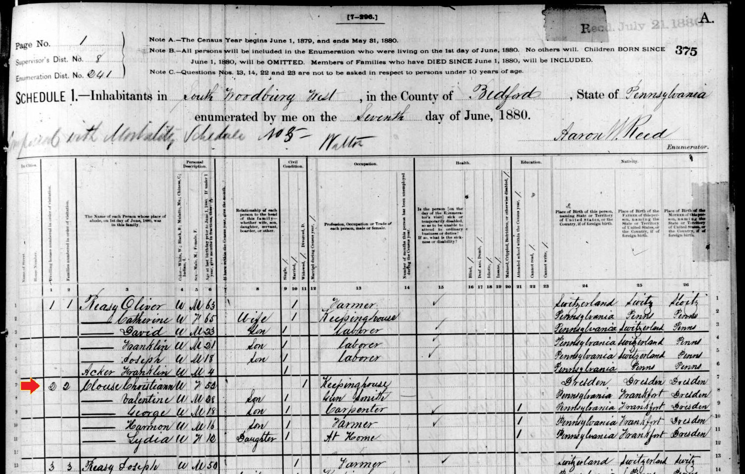 1880: In the 1880 federal census, Christiann Clouse is enumerated as a 52-year-old German-born individual. Living in her household are 28-year-old Pennsylvania-born gunsmith Valentine Clouse, along with 18-year-old George, 16-year-old Harmon, and 12-year-old Lydia.