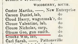 George Clouse is known as a Bedford County gunsmith from tax, census, and estate records and a directory listing.