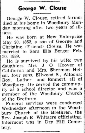 1864: The following death certificate of Herman Clouse indicates that he was born at New Enterprise on October 30, 1864, and was the son of George Clouse and Mary Christine Friend, who were both born in Germany. The February 12, 1895 Bedford County marriage license application of Herman Clouse and Annie Ferry and the October 21, 1911 marriage license application of Herman Clouse and Effie Koontz indicate that Herman's parents were George and Christine Clouse.