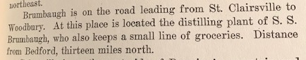 1877: The following image is from the South Woodbury Township portion of the 1877 book "County Atlas of Bedford Pennsylvania". It shows the residence of a "G. Clouse" near the populated place that is now known as Brumbaugh. Brumbaugh is located where the A. W. Reed distillery and hotel are shown.