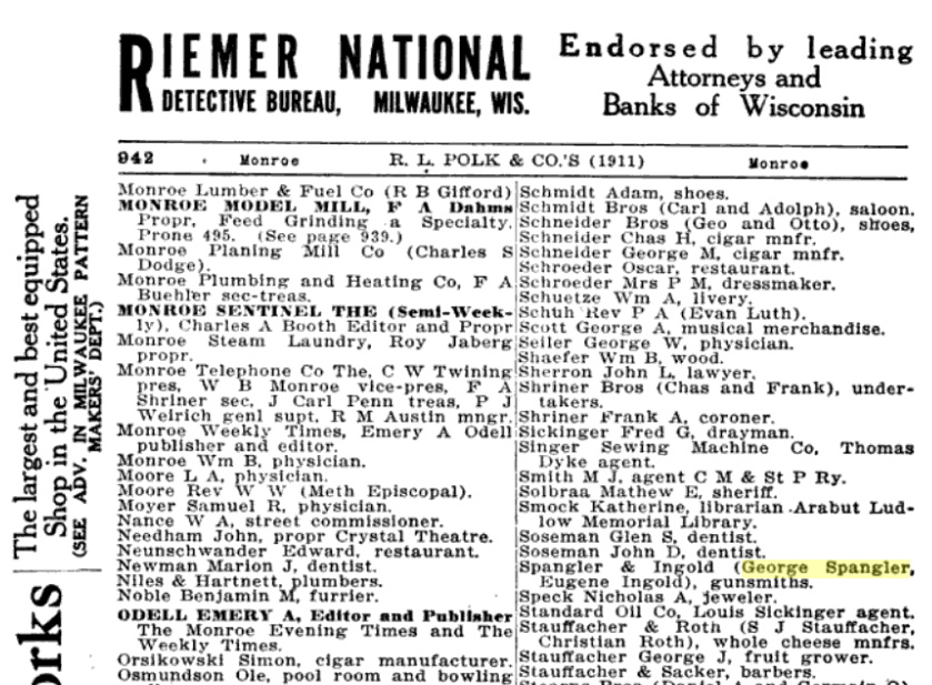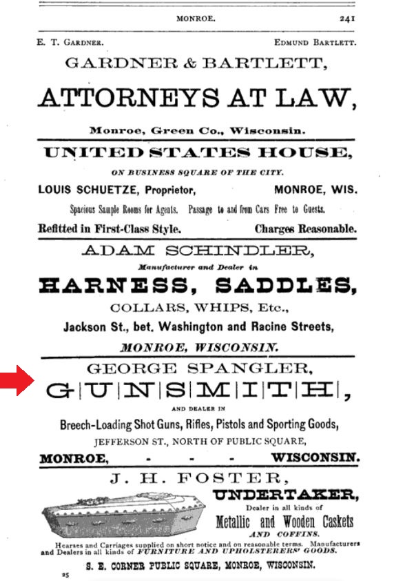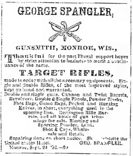 1900: The following excerpt from the 1910 census records of Monroe, Wisconsin indicates that George Spangler had a gun repair shop.