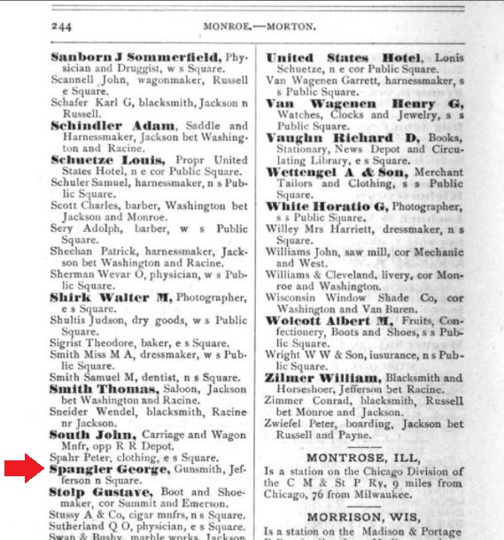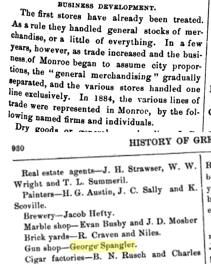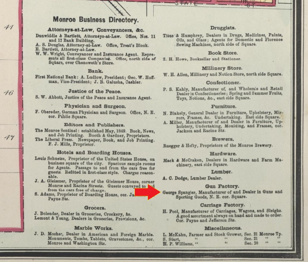 1884: Click here to see an excerpt from the 1884 Sanborn fire insurance map of Monroe, Wisconsin that identifies the location of George Spangler's gun shop on Jefferson Street, north of the square.
