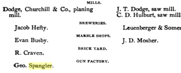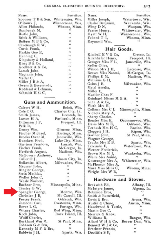 1875: The following images show George Spangler's gunsmithing-related entries in the 1875 book "Gazetteer and Directory of the Chicago, Milwaukee & St. Paul Railway and Branches". It shows that by 1875 he was a dealer in breechloading firearms.