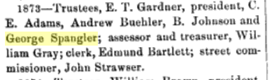 1873: The following is from the Monroe section of the 1884 book "History of Green County, Wisconsin" and indicates that George Spangler served as a trustee that year: