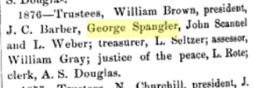 1876: The following is from the Monroe section of the 1884 book "History of Green County, Wisconsin" and indicates that George Spangler served as a trustee that year: