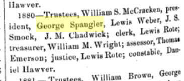 1880: The following is from the Monroe section of the 1884 book "History of Green County, Wisconsin" and indicates that George Spangler served as a trustee that year: