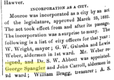 1884: The following is from the Monroe section of the 1884 book "History of Green County, Wisconsin" and indicates that George Spangler served as mayor that year: