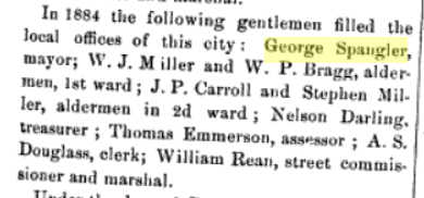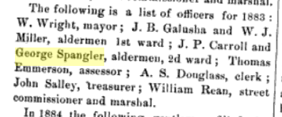 1883: The following is from the Monroe section of the 1884 book "History of Green County, Wisconsin" and indicates that George Spangler served as an alderman that year: