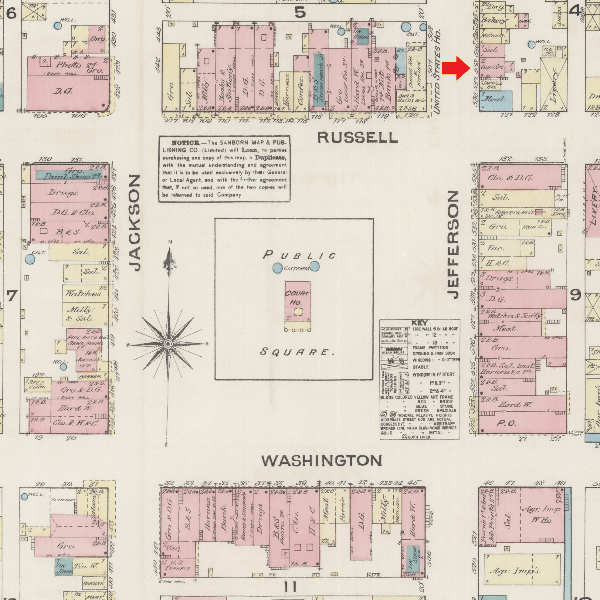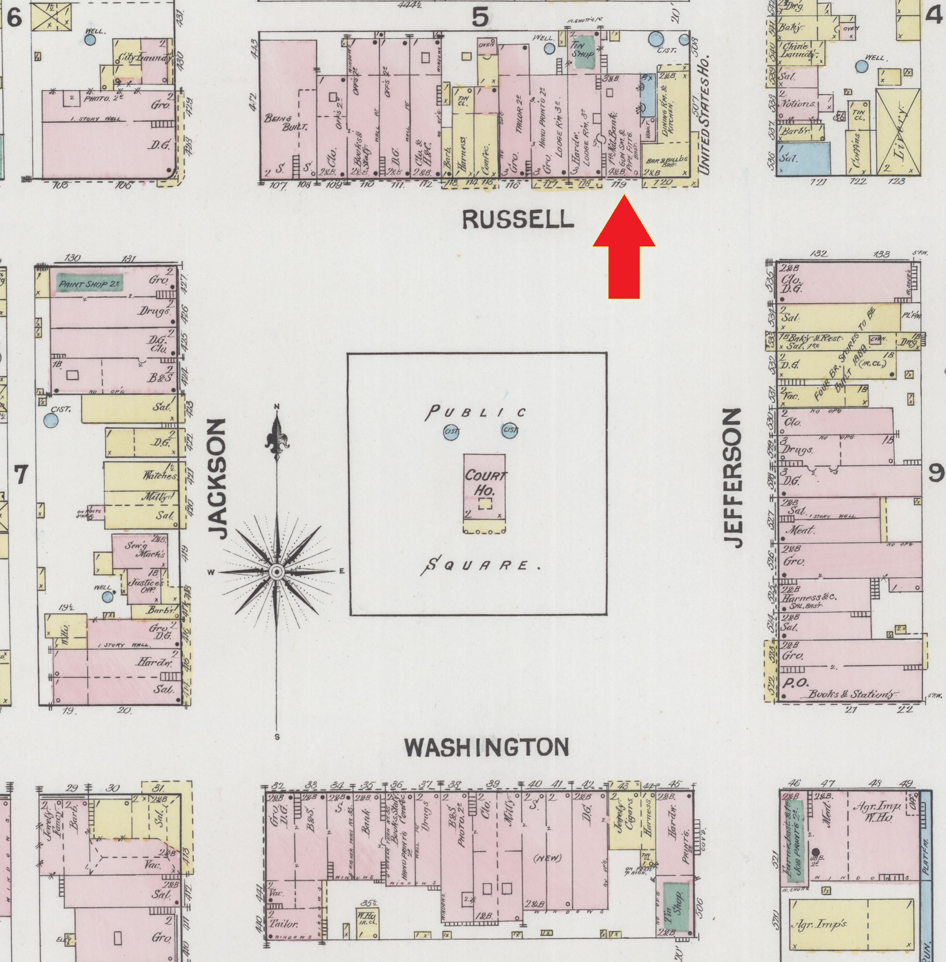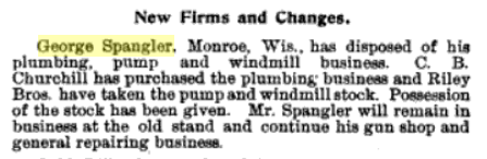 1889: Click here to see an excerpt from the 1889 Sanborn insurance map of Monroe, Wisconsin that identifies the location of George Spangler's gun and plumbing business on the north side of Jefferson Square.
