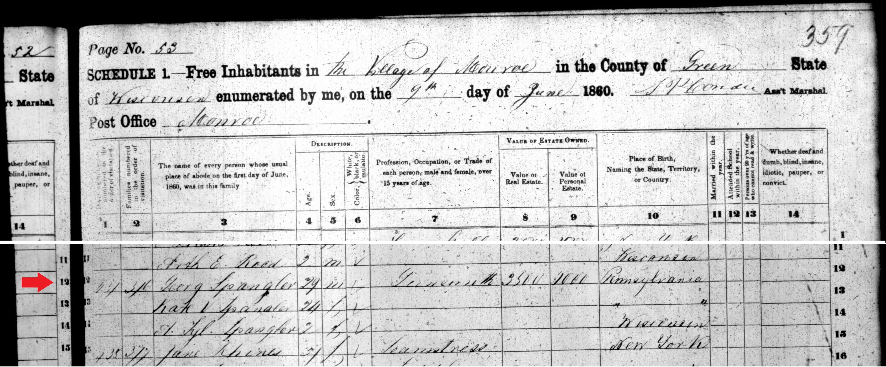 1860: The following excerpt is from the 1860 census records of the village of Monroe in Green County, Wisconsin.