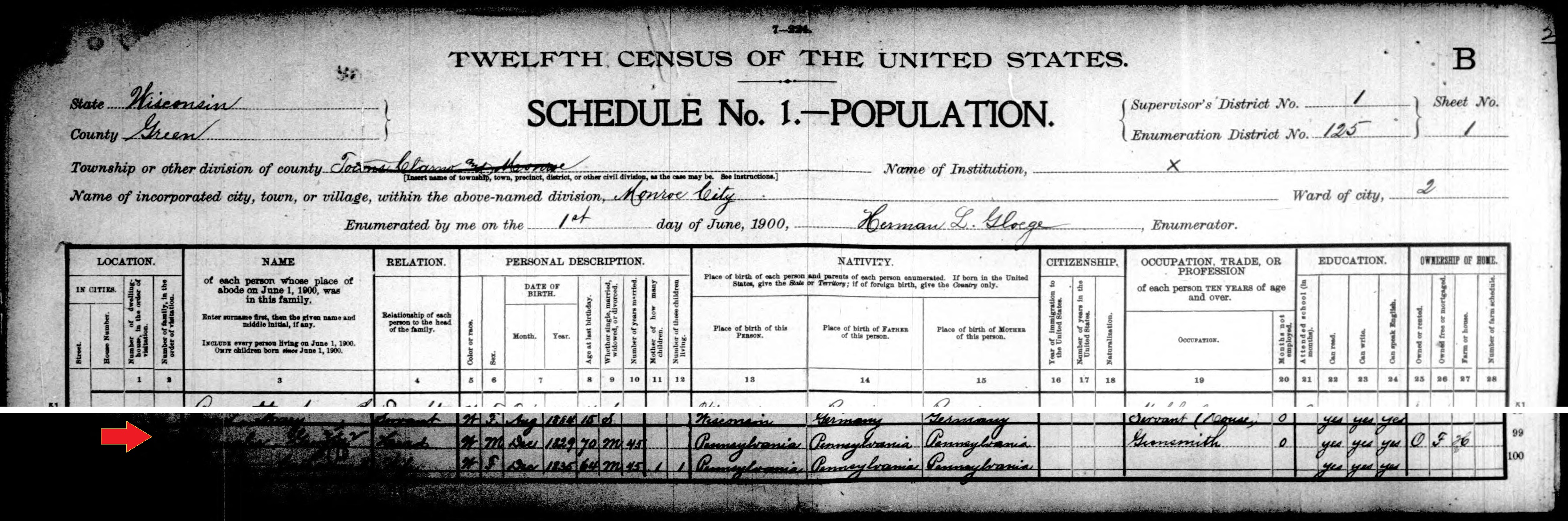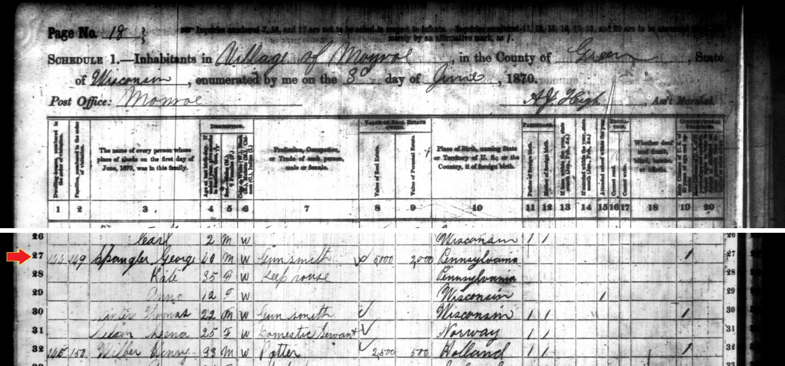 1900: The following excerpt from the 1900 census records of Monroe, Wisconsin indicates that George Spangler was a gunsmith who was born in Pennsylvania in December of 1829.