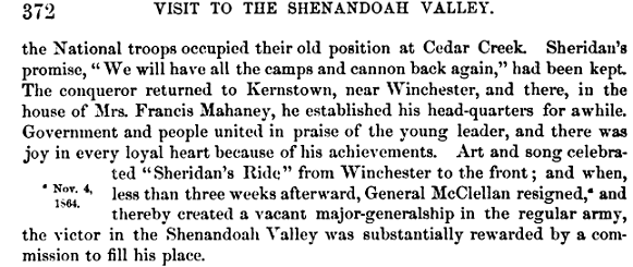 Jonathan Dormayer and his brother David Dunmeyer served with Sheridan in the Shenandoah Valley in the fall of 1864. They were in separate regiments. David was severely wounded on September 19, 1864 and Jonathan was severely wounded on October 19, 1864--the day of Sheridan's famous ride to rally the troops. The following excerpt from Volume III of the 1877 book "Pictorial History of the Civil War in the United States of America" tells the story of that fateful one month period.