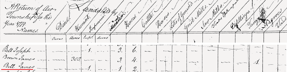 1779: As shown by the following composite image, James Bell is listed on the 1779 tax assessment of Ayr Township, Bedford County. This means that James Bell did not reside within the present bounds of Bedford County in 1779, and is beyond the scope of this web project.