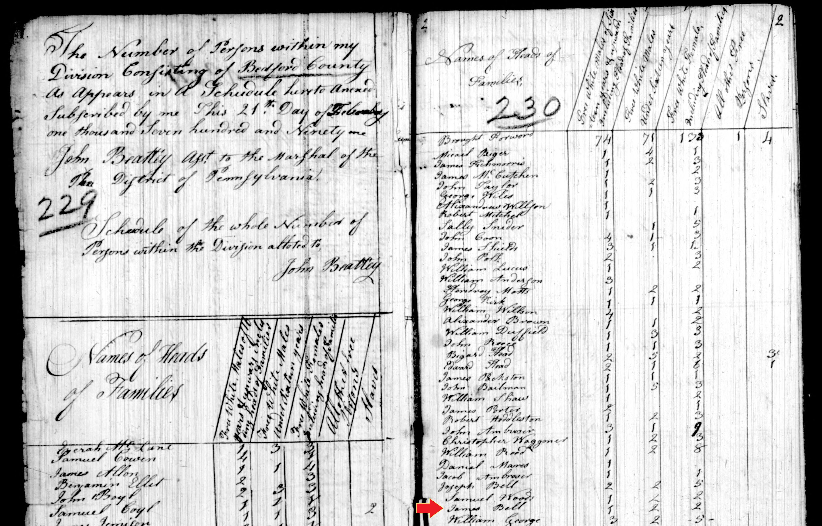 1790: The following excerpt from the manuscript 1790 census records of Bedford County, Pennsylvania includes a listing for a James Bell household.