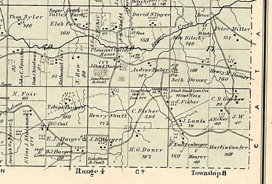 1875: The following excerpt is from the German Township map in the 1875 book "Caldwell's atlas of Holmes County, Ohio". It shows M. G. Doner owning the southeast quarter of Section 25 and shows C. Fisher owning the northeast corner. The Fisher Cemetery is in the northeast corner of the northeast quarter of Section 25, near the Dunker Church. The 1914 book referenced above indicates that the church was built in 1871.