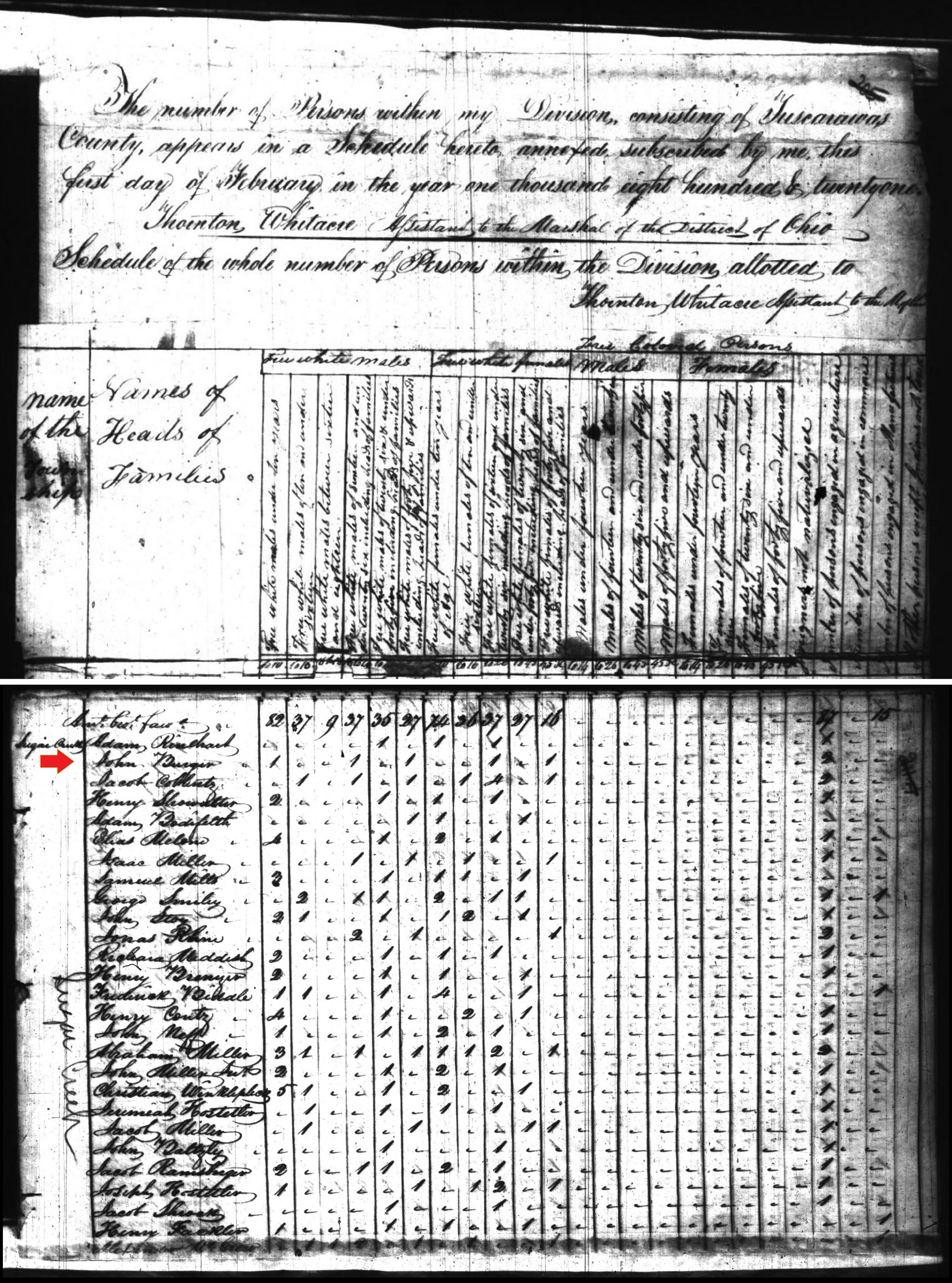 1820: Click here to see the John Burger listing in the manuscript 1820 census records of Sugar Creek Township, Tuscarawas County, Ohio. The image is a composite, made with a table from one page of the census, and a table header from another page.