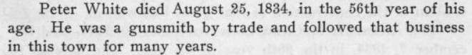 1834: Page 664 of Hadden's 1913 book "A history of Uniontown..." indicates that the Uniontown gunsmith Peter White (John White's father) died On August 25, 1834.