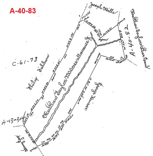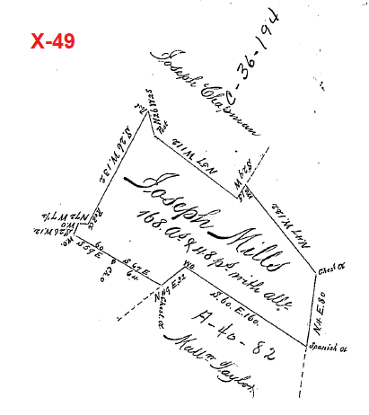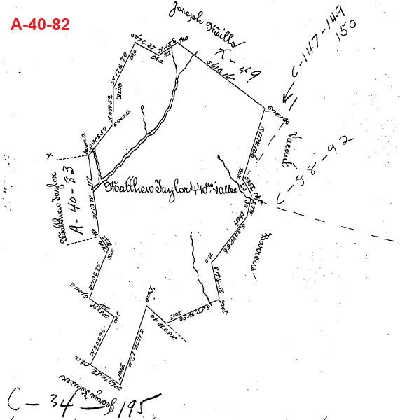 Survey A-40-82 (below) is located on the south side of Joseph Mills' survey X-49 and shows three creeks flowing south. The sources of two of the creeks are shown, and the third creek flows south from the Joseph Mills survey X49. Survey A-40-82 states, "Situated on the head Waters of Piney Run and Town Creek in Southampton Township..." Piney Run is to the west of Town Creek, and both flow to the south.
