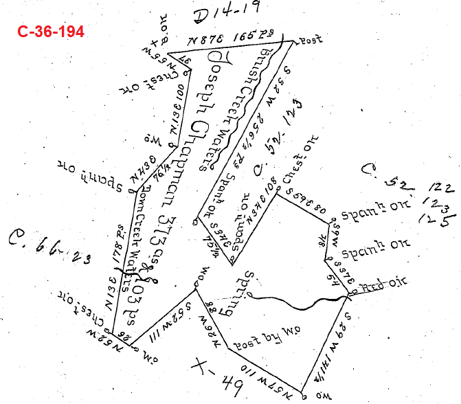 Survey C-36-194 (below) is located on the north side of Joseph Mills' survey X-49 and states that it is "Situated on the Waters of Brush Creek and Town Creek in the Township of Providence...". Survey C-36-194 shows the sources of three creeks, one flowing north, one flowing east, and one flowing west.