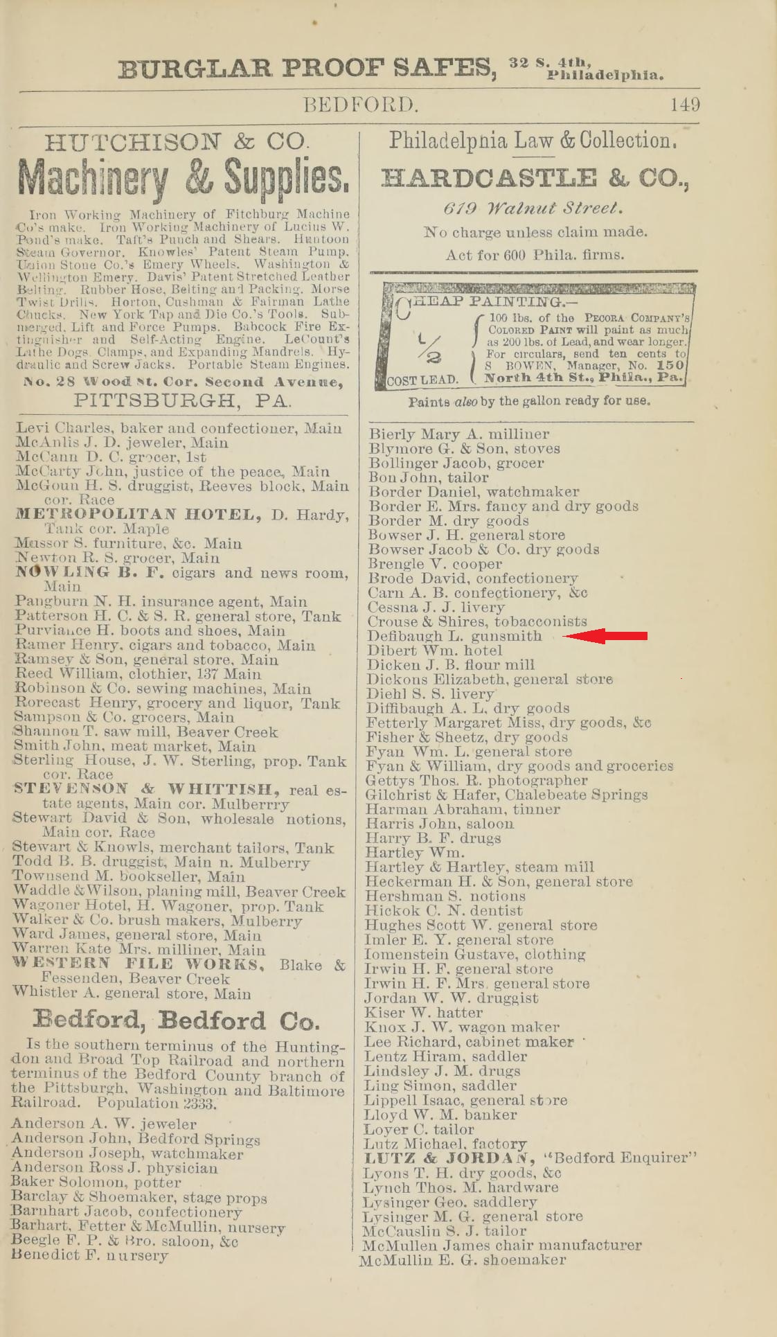 1873: In 1873, Lawrence Deffibaugh was listed as a gunsmith in the Bedford section of "Boyd's Business Directory of Over One Hundred Cities and Towns in Pennsylvania, 1873-4".