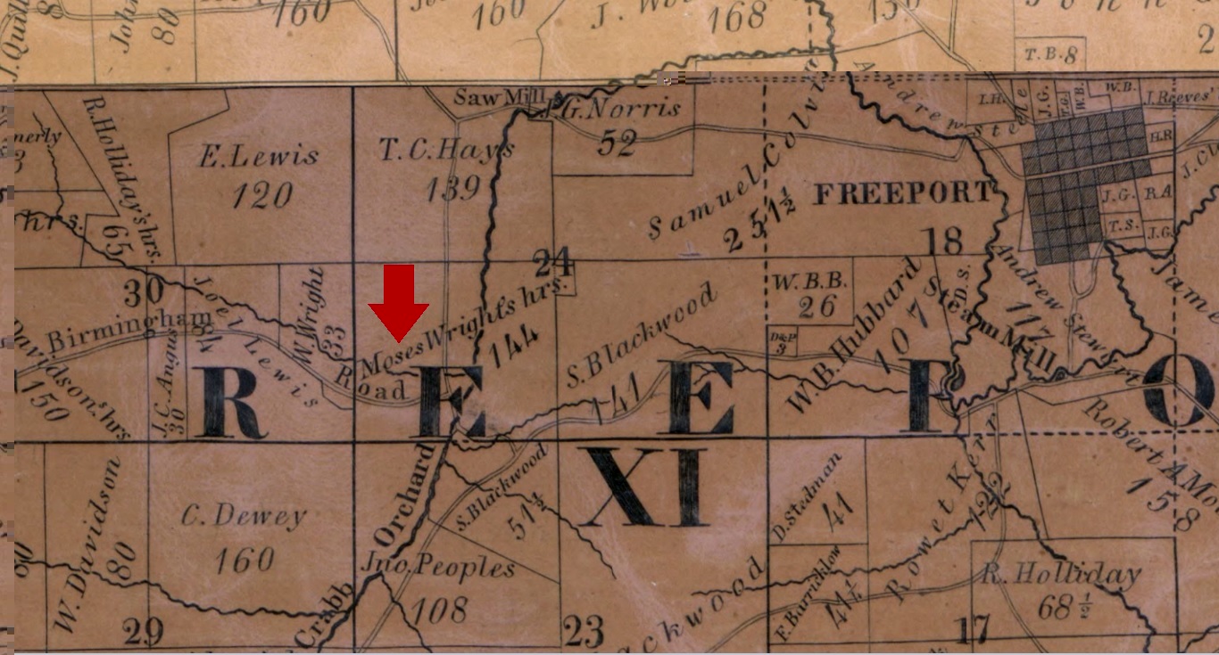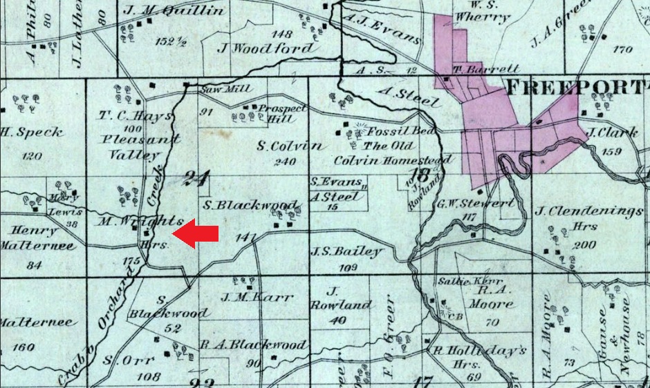 1875: The following excerpt from the Freeport Township map in the 1875 Harrison County atlas identifies building locations on the Moses Wright property.