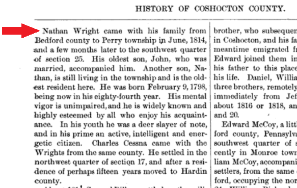 Circa 1814: The following excerpt from the 1881 book "History of Coshocton County Ohio" reports that Nathan and Hannah Wright moved west to Coshocton County, Ohio in 1814. An article titled "Wright Reunion" in the August 22, 1932 issue of the New Philadelphia newspaper "Daily Times" indicates that Nathan and Hannah (Worley) Wright came to Coshocton County, Ohio and settled in 1816.