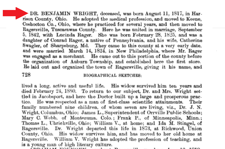 1820: Moses Wright's will indicates he had a son named Benjamin. The September 2003 AOLRC newsletter has an article by Barbara Wright Makee that indicates Moses Wright's gunsmith/physician son Benjamin Wright was born in Ohio on August 11, 1820 and died on March 20, 1874. The article has photos of Moses, Benjamin, and William Wright and their rifles, and a biography of Benjamin Wright that references the following material in the 1884 book "The History of Tuscarawas County Ohio":