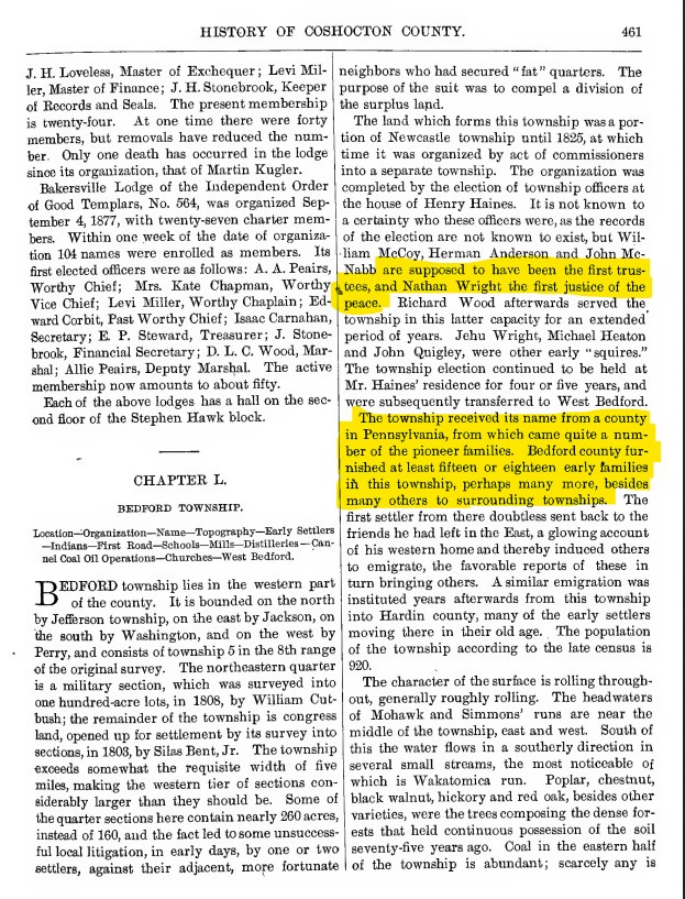 1825: Page 461 of the 1881 book "History of Coshocton County Ohio" indicates that although the election records were lost, Nathan Wright was supposed to have been the first Justice of the Peace when Bedford Township was formed in 1825. The page goes on to say, "The township received its name from a county in Pennsylvania, from which came quite a number of the pioneer families. Bedford County furnished at least fifteen or eighteen early families in this township, perhaps many more, besides many others to surrounding townships."