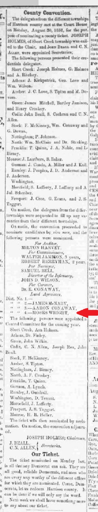 1852: The following item is from the September 1, 1852 issue of the "The Democratic sentinel and Harrison County farmer". It indicates that Moses Wright Sr. or Jr. was nominated for public office.