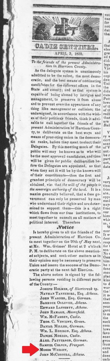 1835: The following political letter was published in the April 3, 1835 issue of the "Cadiz Sentinel" newspaper, and signed by Moses Wright.