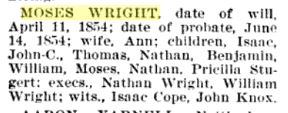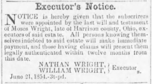 1854: The following notice, which relates to the estate of Moses Wright, is from the July 12, 1854 issue of the "Cadiz Sentinel" newspaper.