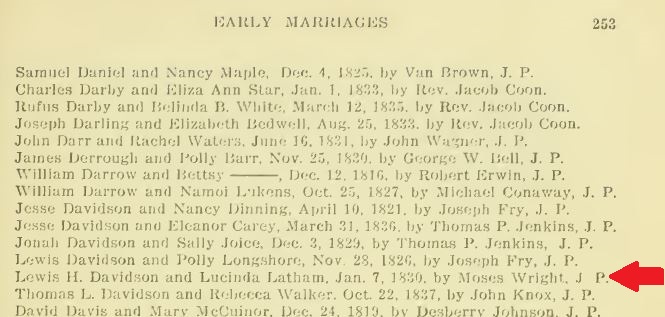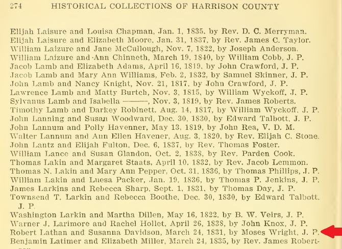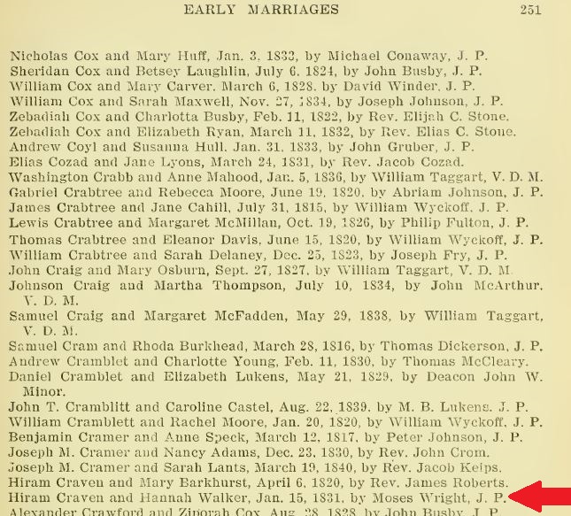 1830-1831: The following pages from the 1900 book "Historical Collections of Harrison County...." show that Moses Wright was a Justice of the Peace in Harrison County, Ohio and in that role performed weddings.