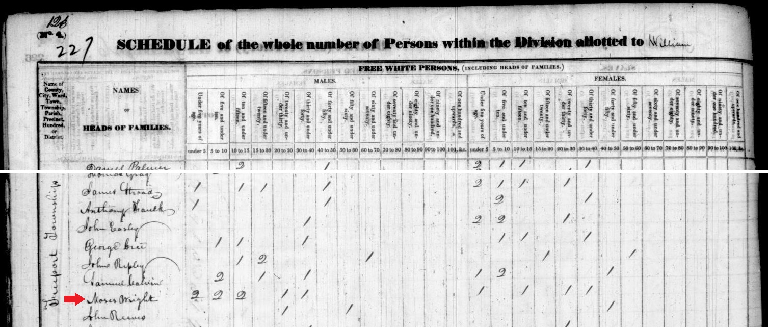 1840: The following listing for Moses Wright is from the 1840 census records of Freeport Township, Harrison County, Ohio.