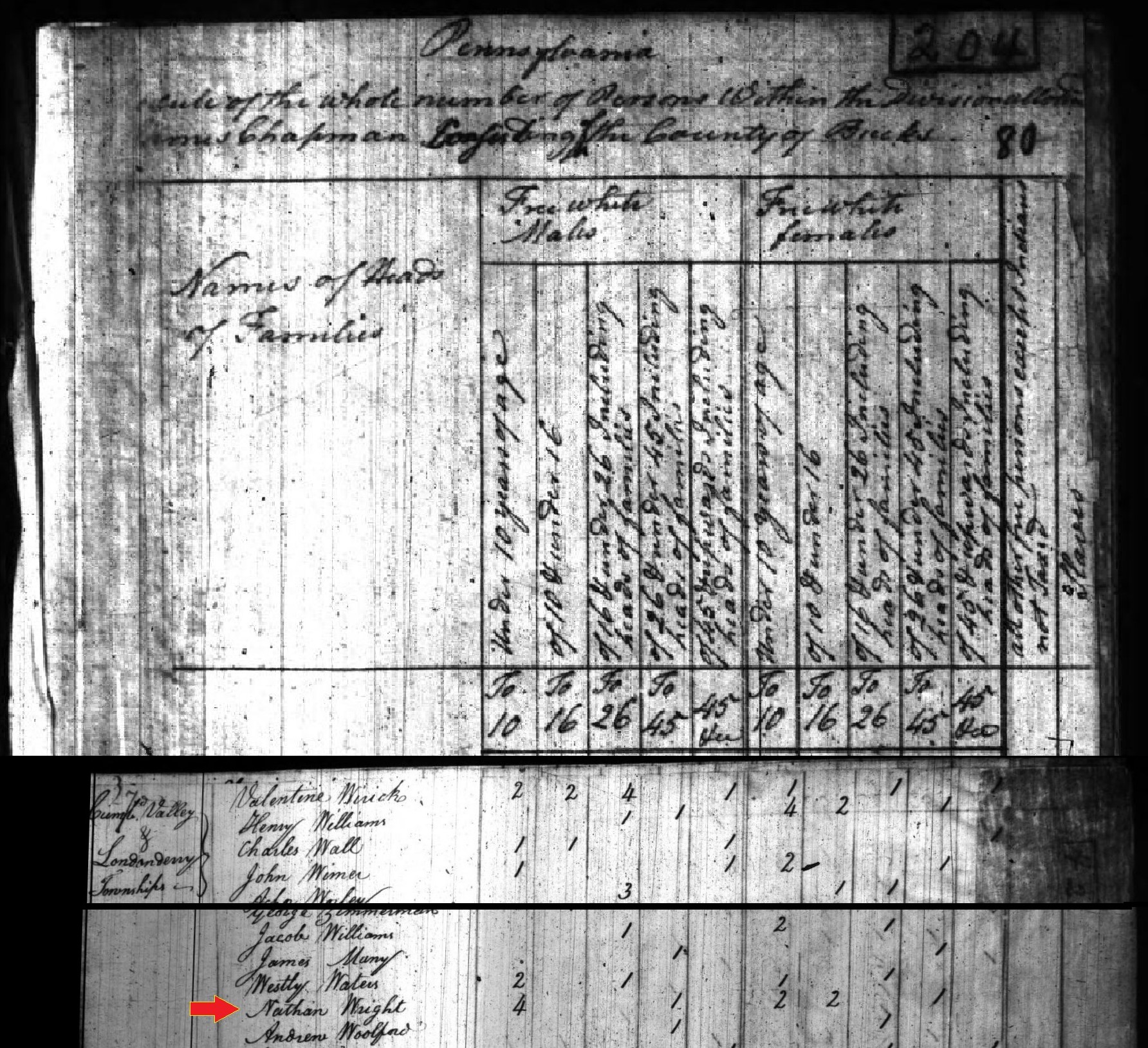 1790: In the Bedford County portion of the transcript of the 1790 census of Pennsylvania that was published in 1908, I did not find a listing for anyone with the first name of Nathan or the last name of Wright, Write, Right, or Rite. I also did not find a listing for anyone named Nathan Wright anywhere in the entire transcript of the 1790 census of Pennsylvania.