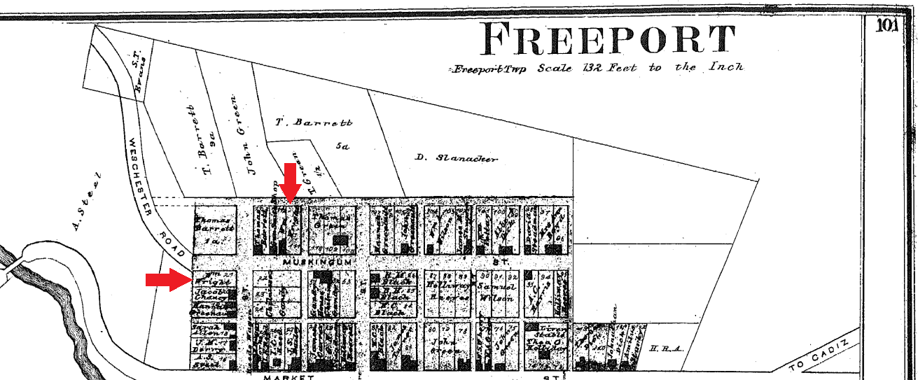 1875: The following excerpt from the Freeport section the 1875 Harrison County atlas shows the lots on Muskingum street that are labeled "Wm. Wright".