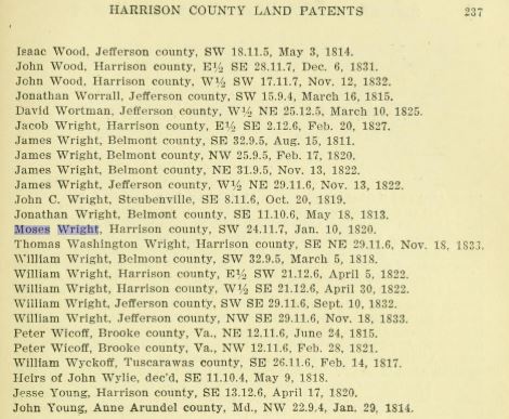 1820: The following list from the 1900 book "Historical Collections of Harrison County...." indicates that Moses Wright received a land patent in Harrison County, Ohio in 1820.