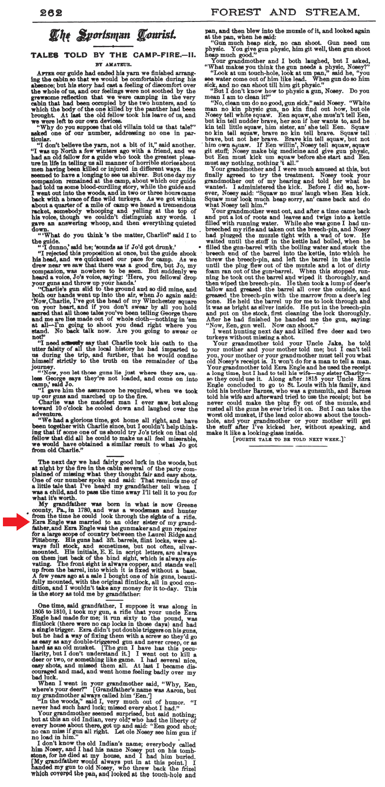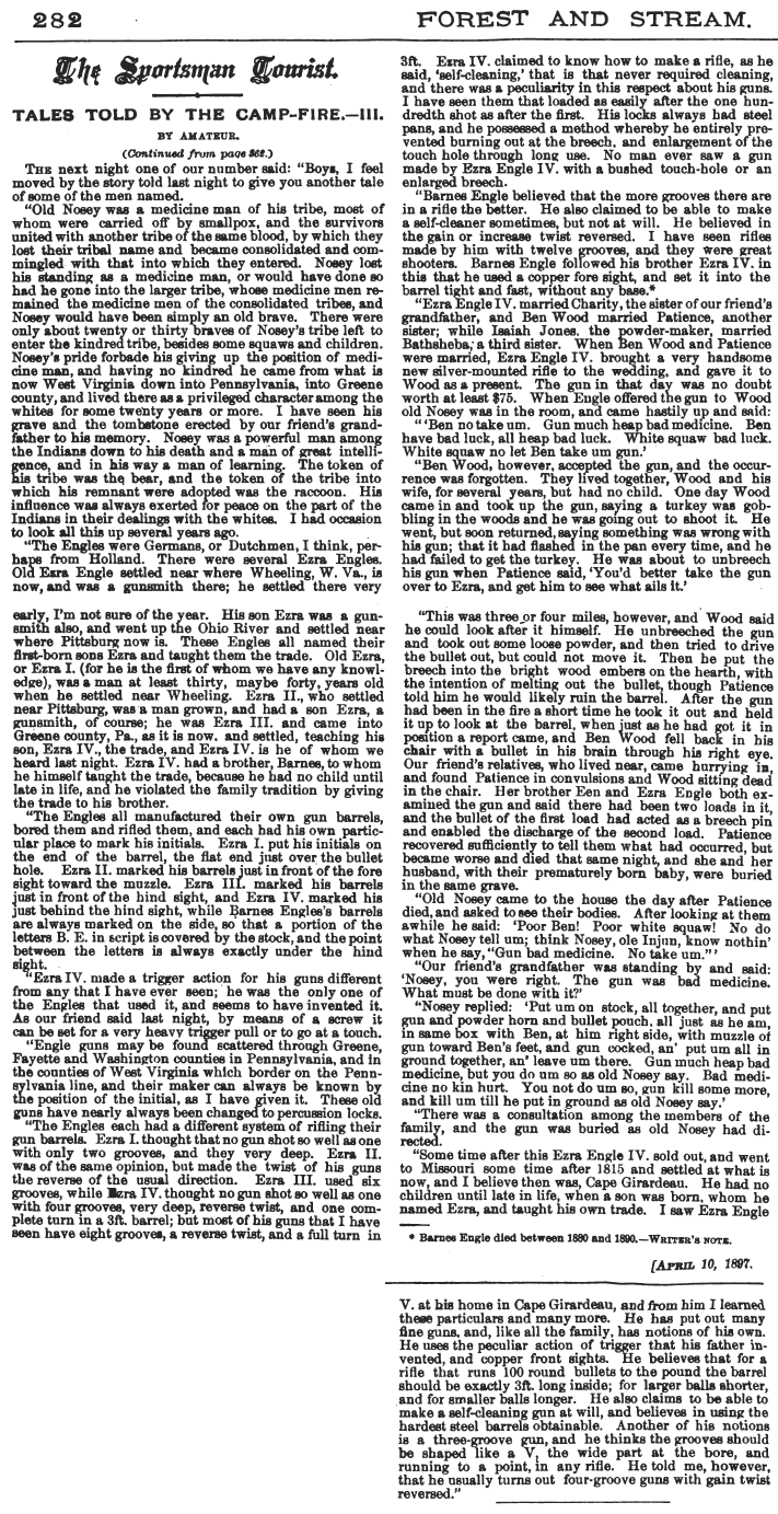 Starting at the red arrow below, this two-part article is a tradition-based 1897 story of the Engle gunsmiths, with what seem to be a few tall tales thrown in in for entertainment value. The article thoroughly mangles the Engle genealogy, calling the head of each Engle generation Ezra, and adding a few generations. In the story, "Ezra III" is Peter Engle, and "Ezra IV" and "Barnes" are Peter Engle's sons Ezra and Barnett. Despite the tall tales and genealogical errors, the article seems to also contain a thread of truth, and I think it is worth sharing.