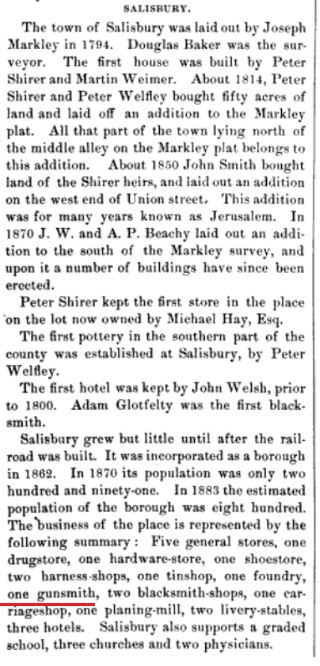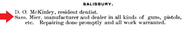 1890: The 1890 book "The Umberger Tragedy" includes a Salisbury-related advertisement that states, "Sam. Mier, manufacturer and dealer in all kinds of guns, pistols, etc. Repairing done promptly and all work warranted."