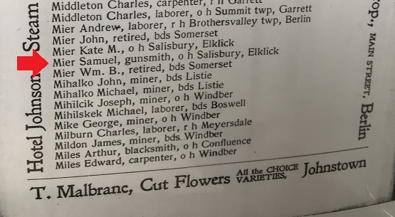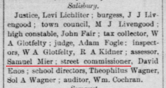1895: The following is from the February 27, 1895 issue of the "Somerset Herald". It identifies Samuel Mier as the Assessor for the Borough of Salisbury, Pennsylvania.