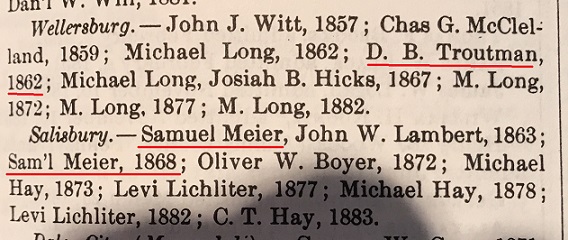 1863 & 1868: The following excerpt from the 1884 book "History of Bedford, Somerset and Fulton Counties, Pennsylvania" shows that Samuel Mier was a Justice of the Peace in Salisbury, Somerset County, Pennsylvania in 1863 and 1868.