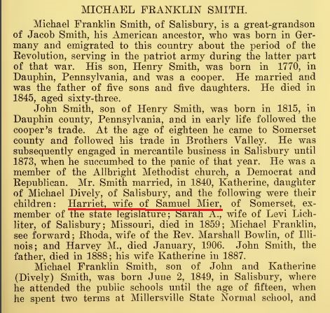 1906: The following excerpt from the 1906 book "History of Bedford and Somerset Counties Pennsylvania" provides information on the ancestry of Samuel Mier's wife Harriet: