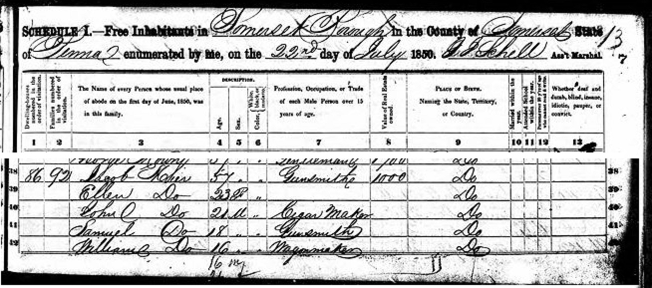 1850: The following composite image of a Somerset Borough sheet from the 1850 census was provided by Glenda Tressler Smith. It shows Samuel Mier as an 18-year-old gunsmith in the household of the gunsmith Jacob Mier. The individuals listed for the family are Jacob, 57, Gunsmith; Ellen, 23; John, 21, Cigar Maker; Samuel, 18, Gunsmith; and William, 16, Wagon maker.