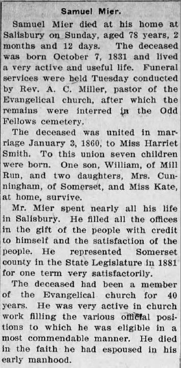 1909: The following obituary of Samuel Mier is from the December 23, 1909 issue of the "Republic" newspaper from Meyersdale, Pennsylvania.