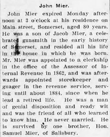 1909: The following obituary of John Mier was identified by Glenda Tressler Smith. It is from the June 17, 1909 issue of the "Republic" newspaper from Meyersdale, Pennsylvania, and indicates that John and Samuel Mier are sons of "Jacob Mier, a celebrated gunsmith in the early history of Somerset".