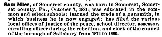 1881: The following biography of House Member Samuel Mier is from the 1881 book "Smull's Legislative Hand Book, Rules and Decisions of the General Assembly of Pennsylvania". It identifies Samuel Mier as a Somerset County gunsmith.