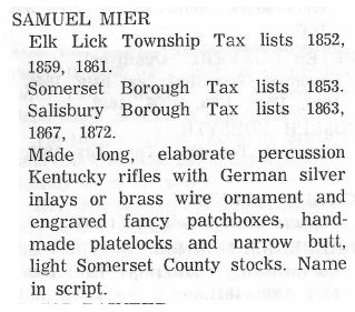 Samuel Mier is known as a Somerset County gunsmith from census and tax records, a county atlas, advertisements, Smull's Legislative Hand Book, newspaper articles, and surviving specimens of his work. Links to pictures of rifles made by or attributed to Samuel Mier are included at the bottom of this web page.